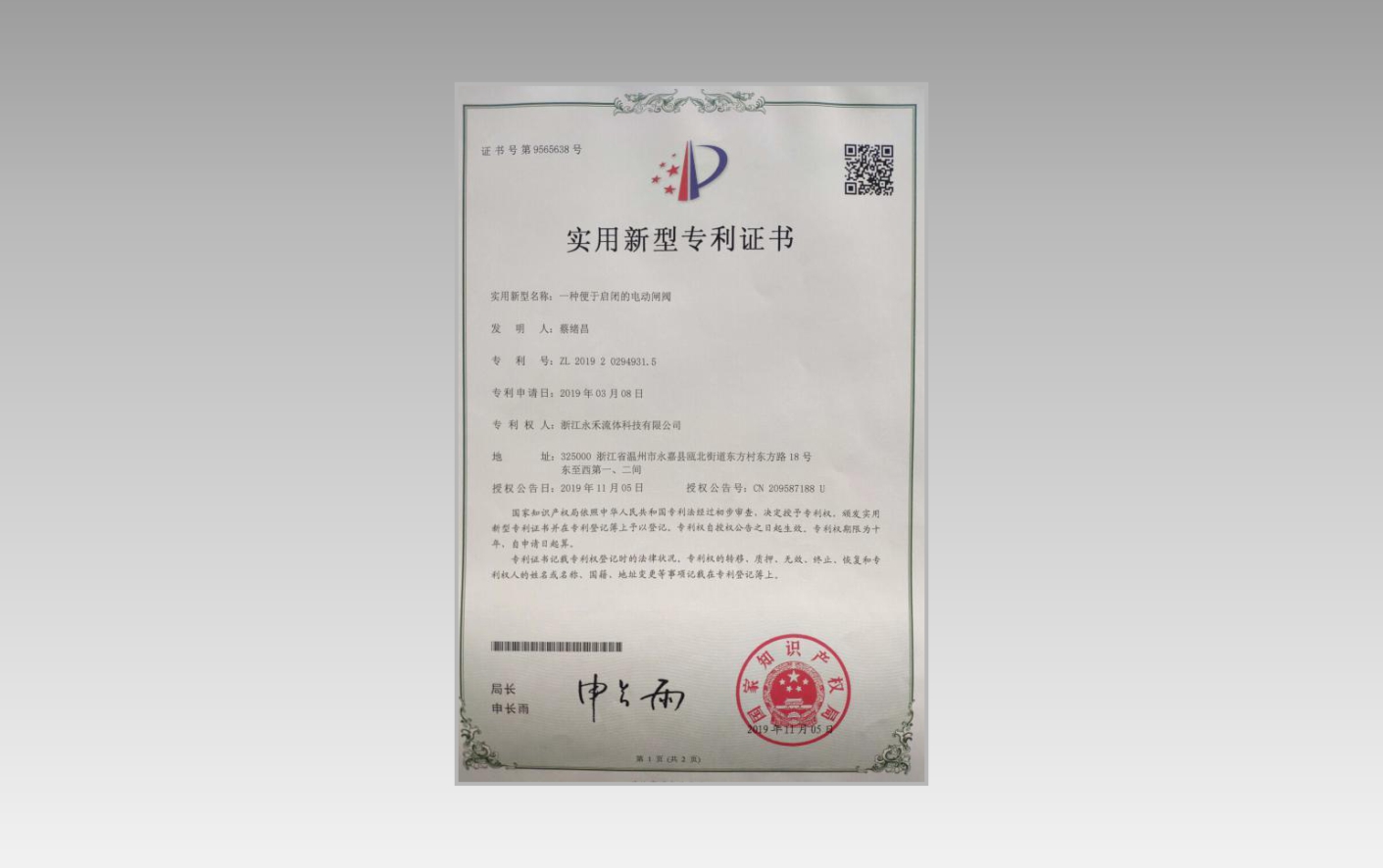 實(shí)用新型專(zhuān)利證書(shū)
