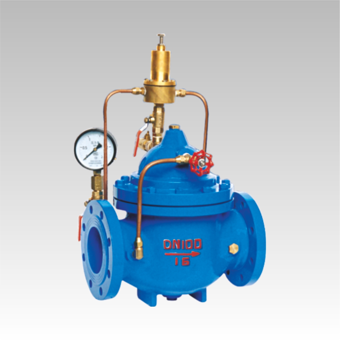 500X泄壓/持壓閥由主閥、導(dǎo)閥、針閥、球閥、微形過(guò)濾器和壓力表組成水力控制接管系統(tǒng)。利用水力自動(dòng)操作,即可以作泄壓閥用又可作持壓閥用。做泄壓閥用時(shí),可維持供水路壓力在設(shè)定的安全值之下,保持主閥上游供水壓力。其工作原理,當(dāng)導(dǎo)閥調(diào)整為泄壓狀態(tài)時(shí),水通過(guò)針閥、主閥控制室、球閥A、導(dǎo)閥、球閥B流向出口,此時(shí)主閥處于開(kāi)啟狀態(tài)。當(dāng)進(jìn)口壓力超過(guò)導(dǎo)閥設(shè)定的安全值時(shí),泄壓導(dǎo)閥會(huì)自動(dòng)開(kāi)啟,通過(guò)球閥C放出部分水,使管路泄壓。當(dāng)壓力恢復(fù)到安全值時(shí),泄壓閥自動(dòng)關(guān)閉,作泄壓閥時(shí),各球閥常開(kāi)。當(dāng)導(dǎo)閥常開(kāi)。當(dāng)導(dǎo)閥調(diào)整為持壓狀態(tài)時(shí),只要主閥進(jìn)口水壓底于導(dǎo)閥設(shè)定值,導(dǎo)閥即關(guān)閉。主要控制使升壓,主閥關(guān)閉。當(dāng)主閥上游供水壓力超過(guò)導(dǎo)閥排至出口,控制室將壓主閥開(kāi)啟,開(kāi)始供水,即保持了上游水壓。作持壓閥用時(shí),球閥C常閉或用絲堵?lián)Q下。本產(chǎn)品利用水力自力控制。不需要其它裝置和能源,保養(yǎng)簡(jiǎn)便,一閥多用。廣泛用于高層建筑、生活區(qū)等供水管網(wǎng)系統(tǒng)及城市供水工程。