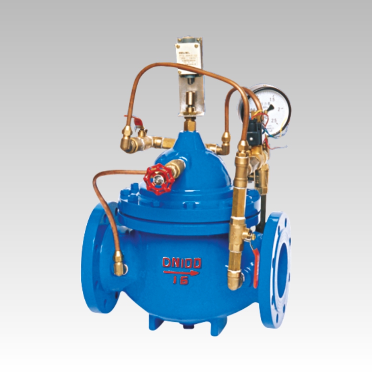 700X水泵控制閥由主閥、電磁導(dǎo)閥、針閥、球閥、單向閥、行程開關(guān)、微形過濾器和壓力表組成水力控制接管系統(tǒng)。水泵需停止工作時,先由進(jìn)口壓使主閥關(guān)閉90%后,水泵停止運轉(zhuǎn)。剩余10%由回水關(guān)閉??深A(yù)防水錘現(xiàn)象發(fā)生。其工作原理:當(dāng)水泵工作閥門向下游供水時,點此導(dǎo)閥全開,針閥調(diào)至適當(dāng)開度,上游水經(jīng)針閥、單向閥進(jìn)入主閥控制室,經(jīng)電磁導(dǎo)閥流出,此時主閥控制室的壓力保持主閥處于合適的開度,保持下游正常供水。當(dāng)水泵停止工作時,電磁導(dǎo)閥先關(guān)閉,主閥控制室停止排水,控制室壓力升高,主閥開始關(guān)閉。當(dāng)關(guān)閉至90%時,主閥上部行程開關(guān)輸出停泵信號,水泵停止運轉(zhuǎn)。此時下游回水晶單向閥進(jìn)入主閥控制室,控制室壓力升高,主閥被關(guān)閉。本產(chǎn)品利用電磁導(dǎo)閥控制,不需要其他裝置和能源。節(jié)約能源,保養(yǎng)簡便,停泵平穩(wěn),廣泛用于高層建筑、生活區(qū)等供水管網(wǎng)系統(tǒng)及城市供水工程。